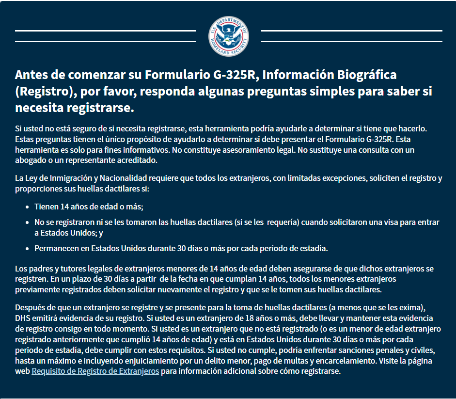 Muchos extranjeros en Estados Unidos ya se han registrado según lo requiere la ley. Sin embargo, un número significativo de extranjeros que están presentes en Estados Unidos no han tenido una manera directa para registrarse y cumplir con su obligación conforme con la sección 262 de la INA. USCIS ha creado un nuevo formulario, G-325R, Información Biográfica (Registro), y un proceso en línea mediante el que los extranjeros se pueden registrar y cumplir con la ley según lo requiere la INA.